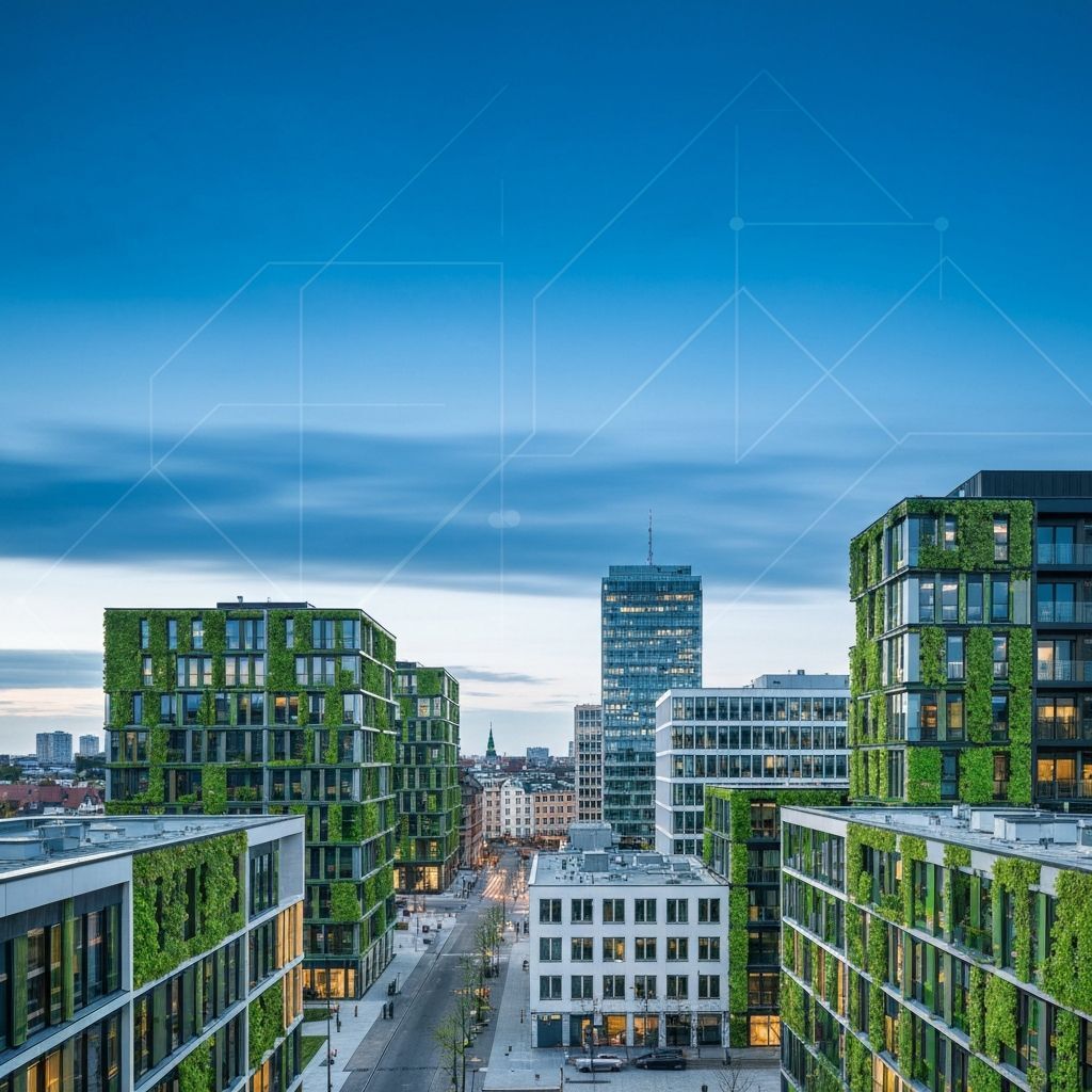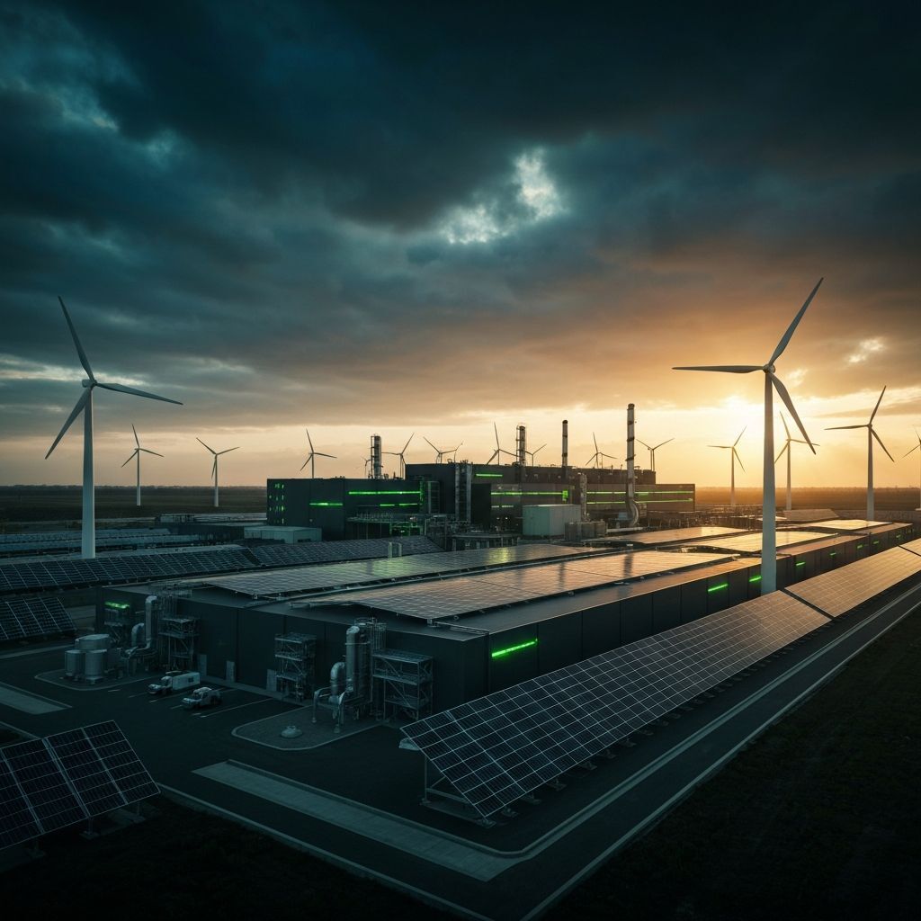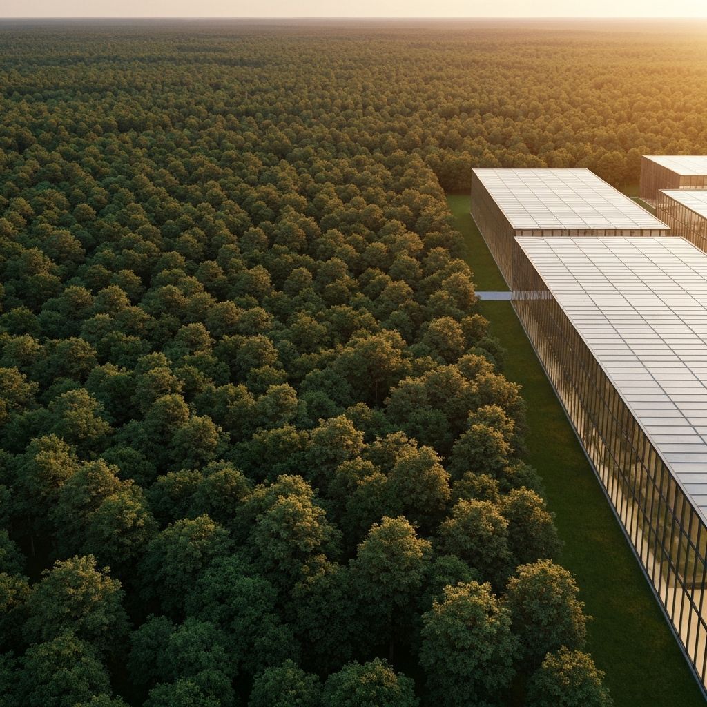 Year 2050 facilities operate on 100% renewable energy with closed-loop water systems and waste-heat recovery for maximum efficiency.