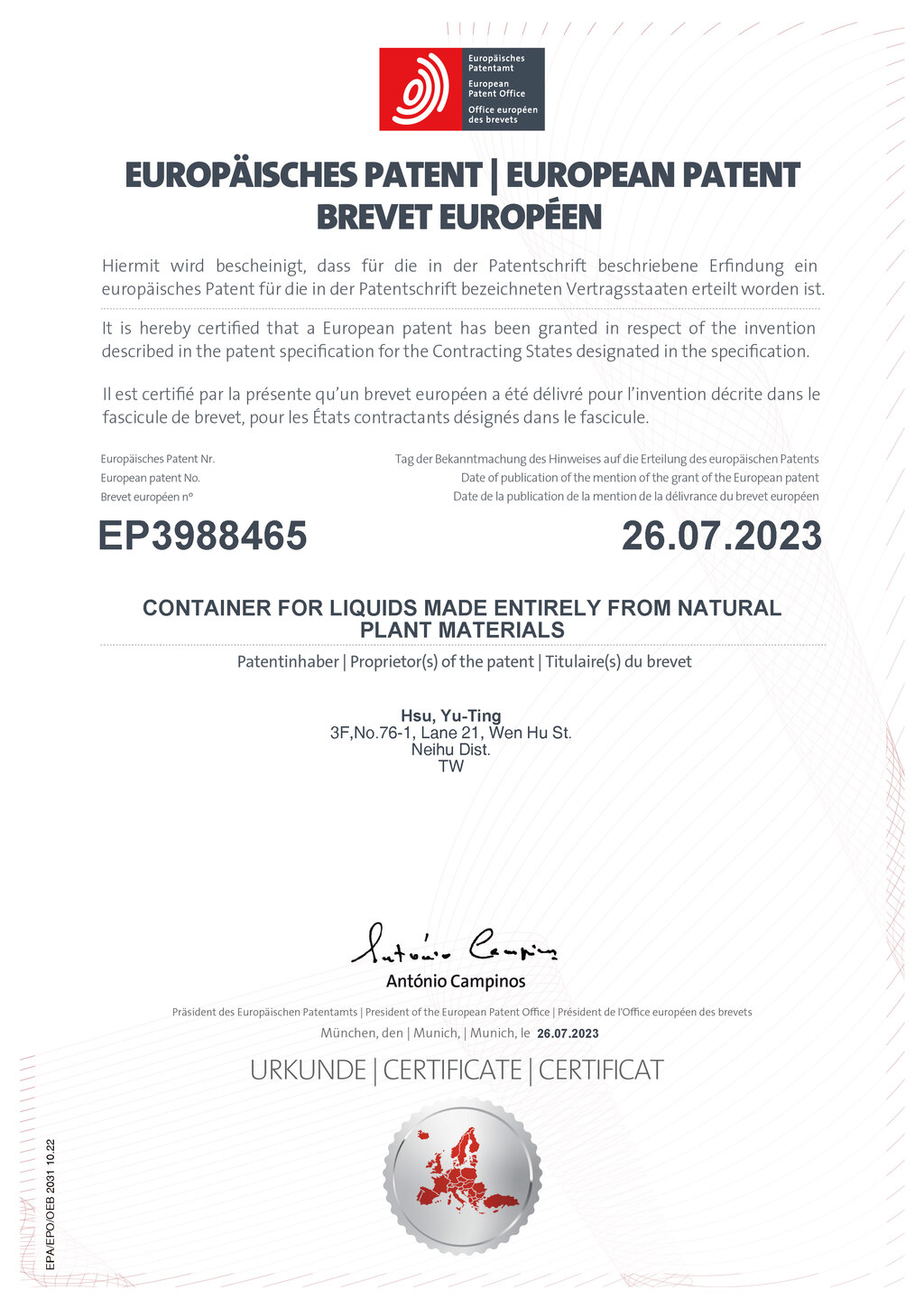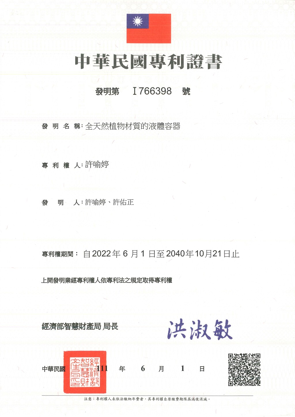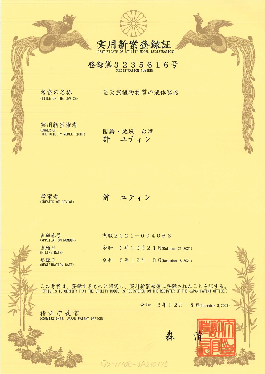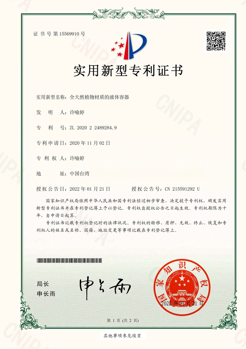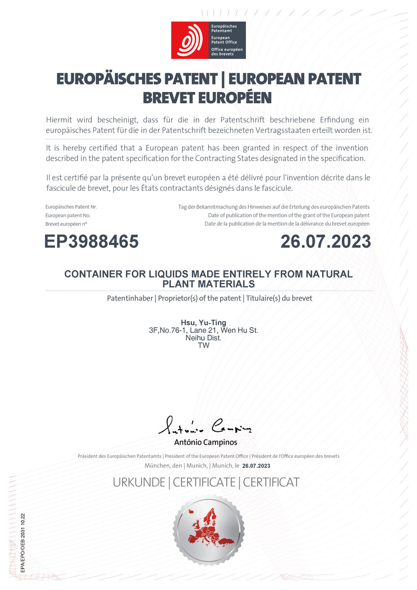 We hold exclusive utility and design patents for our PEF double-layer paper bottles,